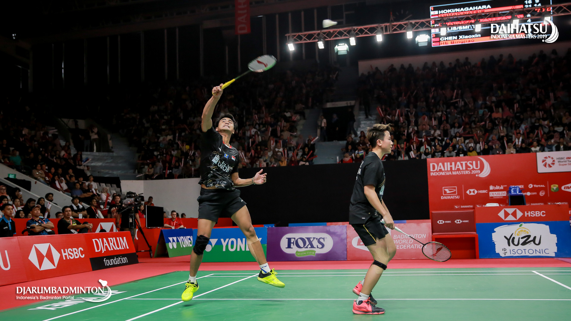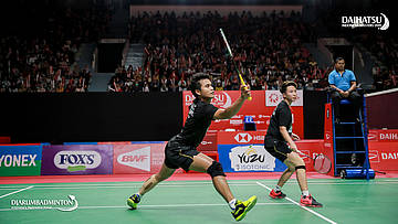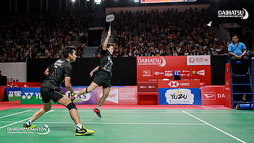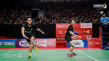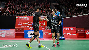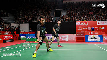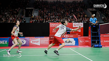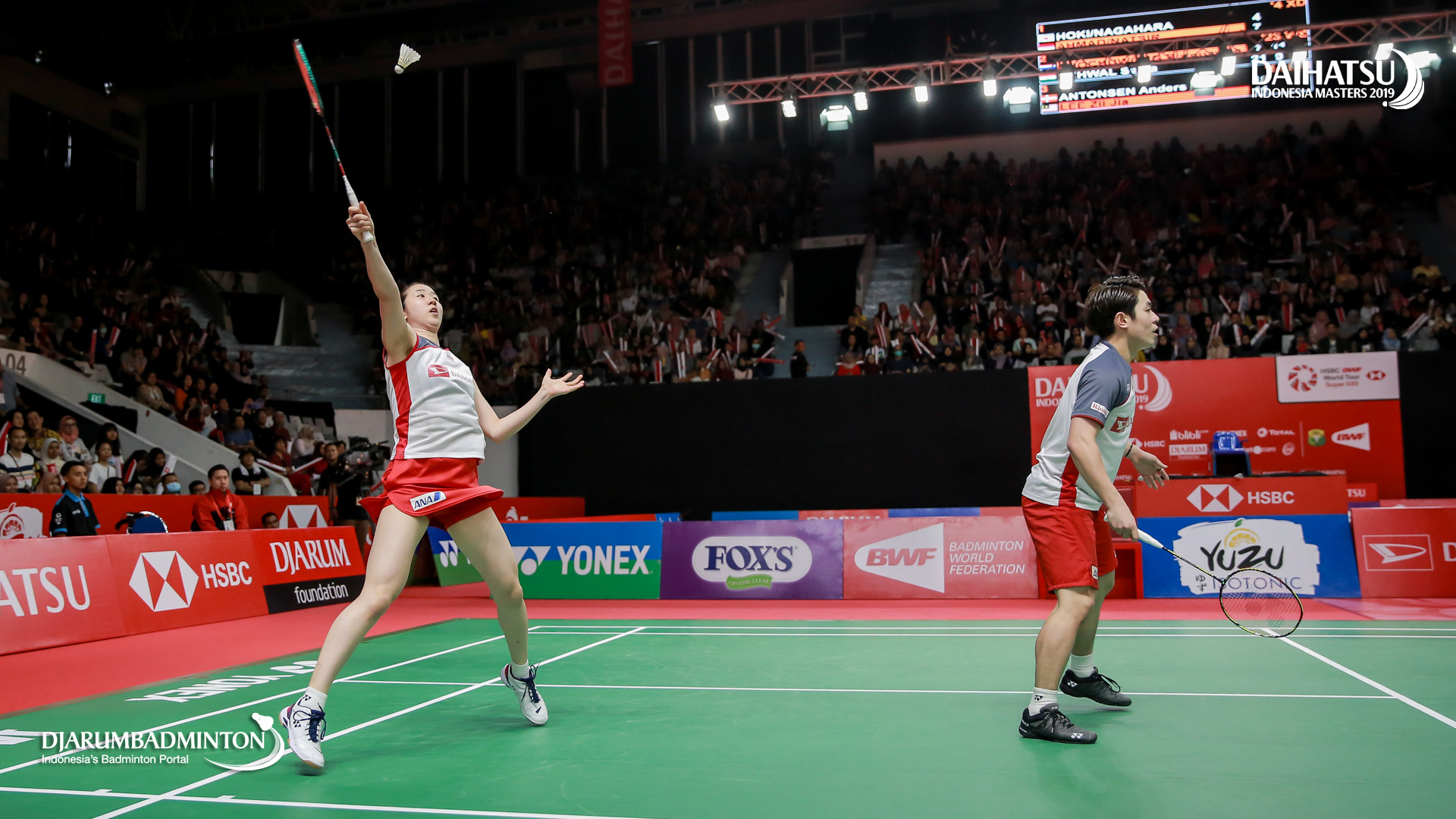 Takuro HOKI/Wakana NAGAHARA (Japan) bersiap mengembalikan shuttlecock
