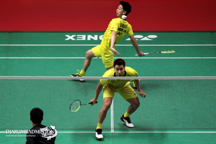 Kevin Sanjaya Sukamuljo/Marcus Fernaldi Gideon (Indonesia) Mengembalikan Shuttlecock