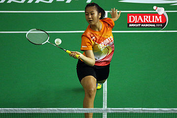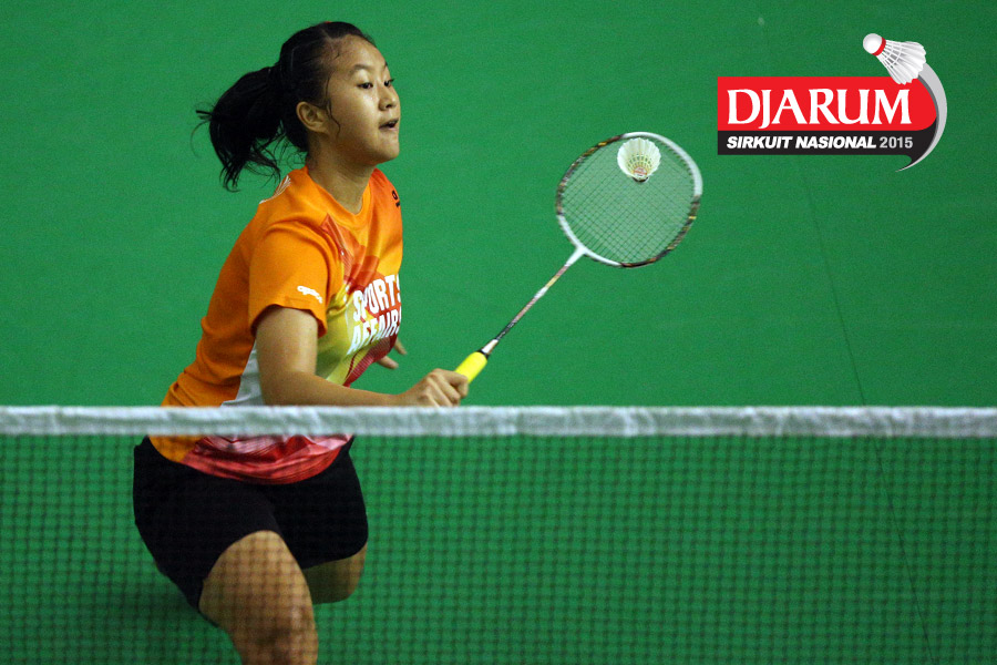 Rusydina Antardayu (Tangkas) mengembalikan shuttlecock ke arah Des Yeni (Guna Dharma).