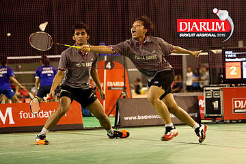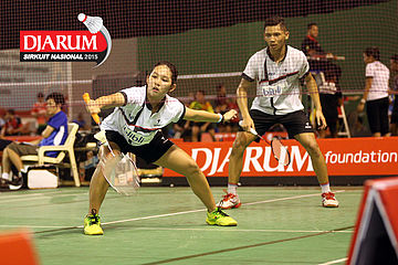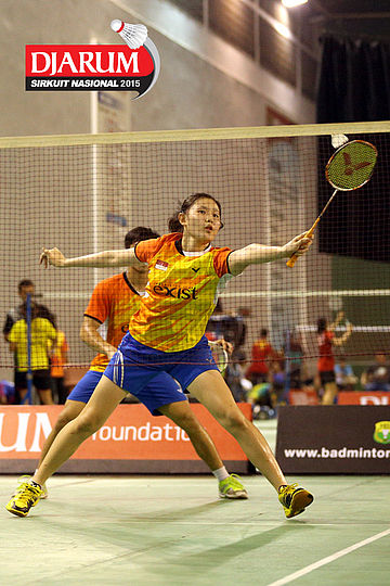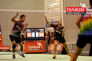 Fauzi Habibie/Apriani Rahayu (Pelita Bakrie) menghadang pengembalian dari Yahya Adi/Ramadhani Putri (Djarum Kudus).