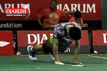 Salah satu atlet terjatuh saat berlatih di GOR Arie Lasut Manado, Sulawesi Utara sebelum penyelenggaraan Djarum Sirkuit Nasional Li-Ning Sulawesi Utara Open 2015.