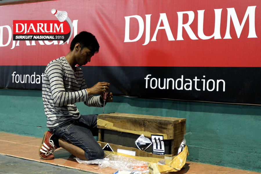 Salah satu pekerja membuka bungkusan perlengkapan live score.