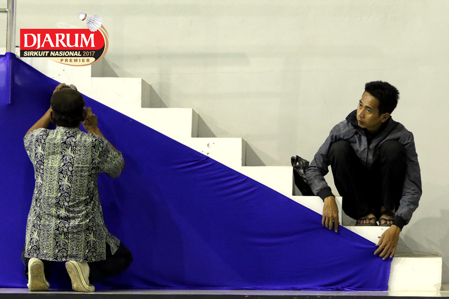 Dua Pekerja Saat Mempersiapkan Atribut Djarum Sirkuit Nasional Li-ning Premier Jawa Barat Open 2017