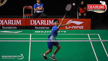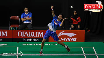 Auditya Alpha Hidayat (Mutiara Cardinal, Bandung) bersiap menyambar shuttlecock