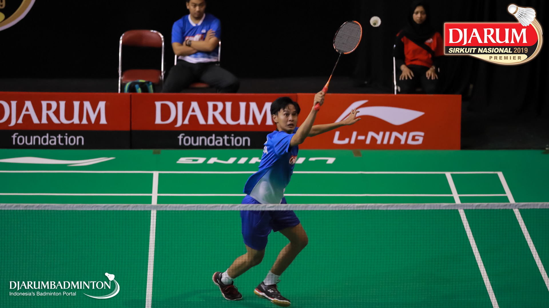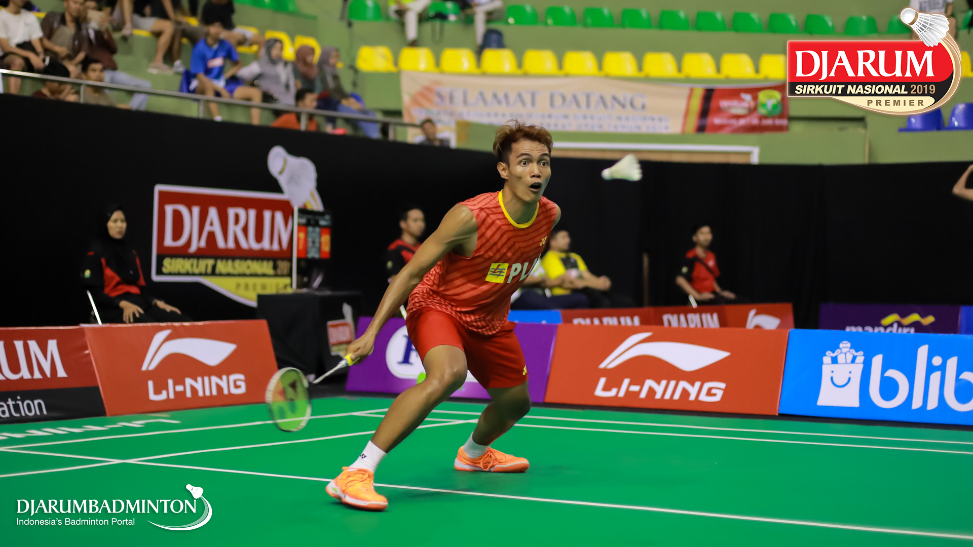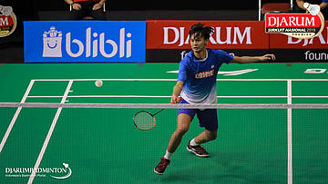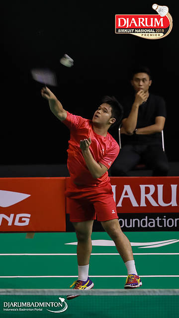 Auditya Alpha Hidayat (Mutiara Cardinal, Bandung) bersiap menyambut shuttlecock