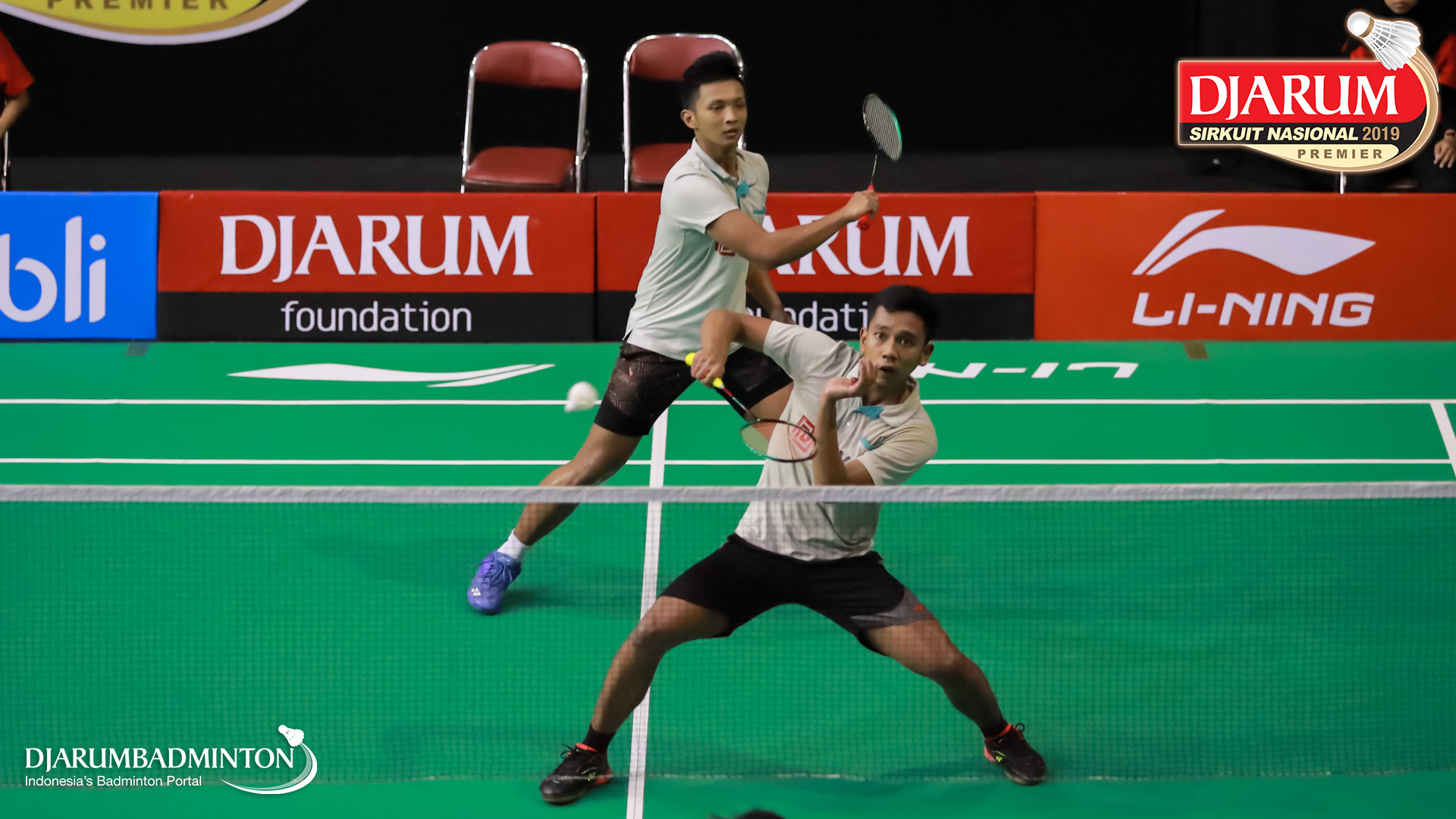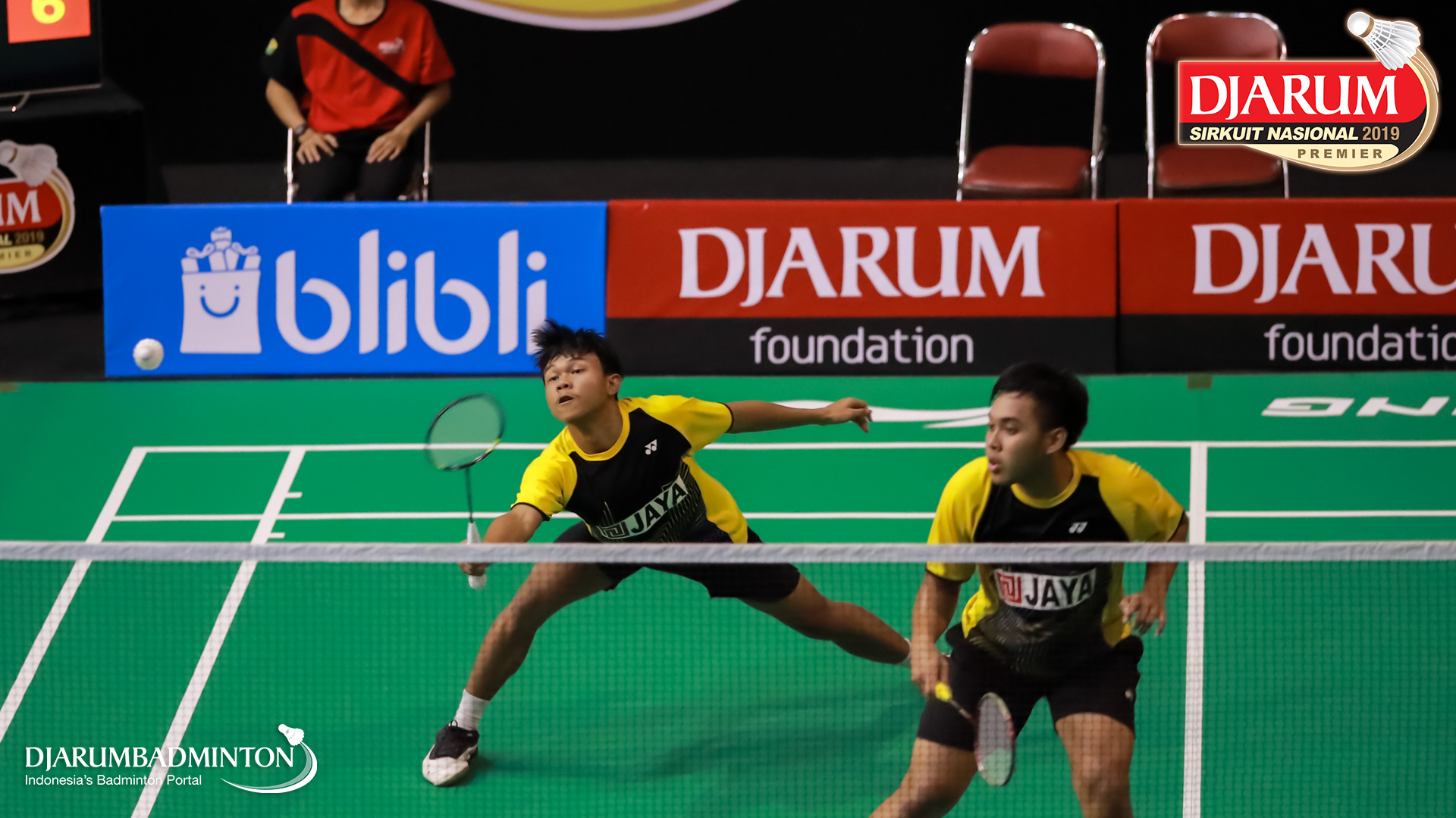 Alif Atallah Juan Setiawan+Teges Satriaji Cahyo Hutomo (Jaya Raya Jakarta) mengembalikan shuttlecock