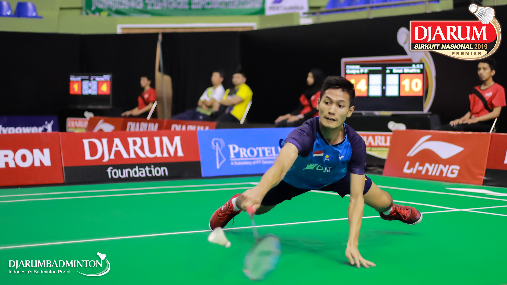 Gatjra Piliang Fiqihilahi Cupu (Pelatnas) berusaha menggapai shuttlecock