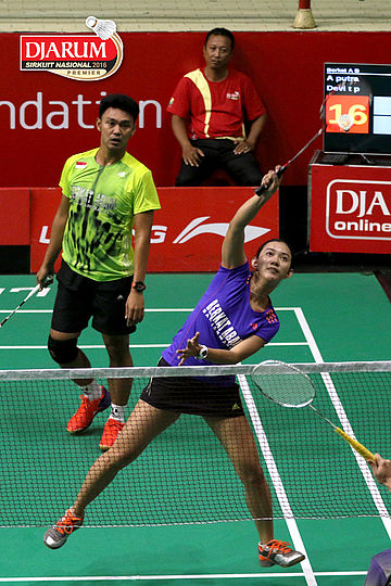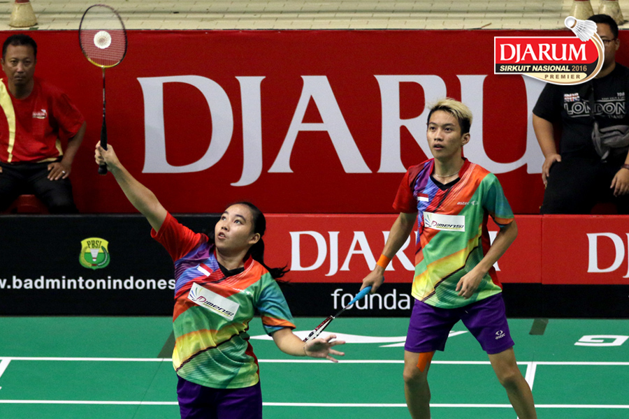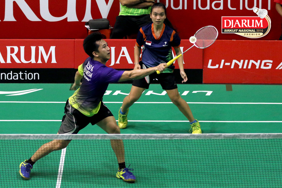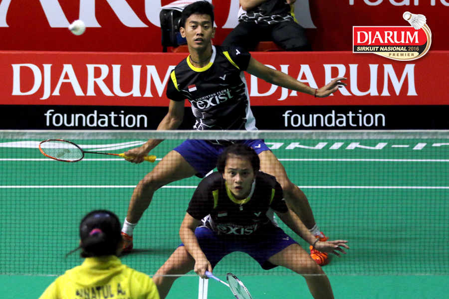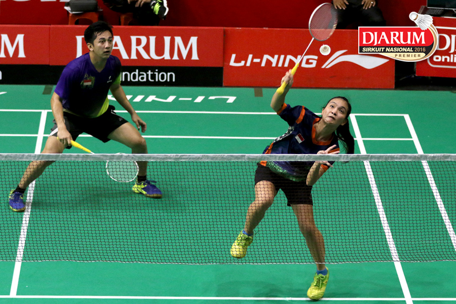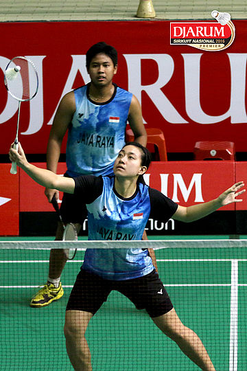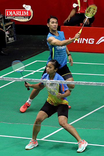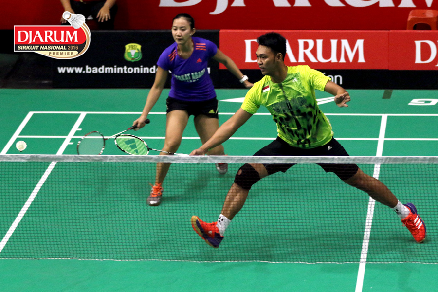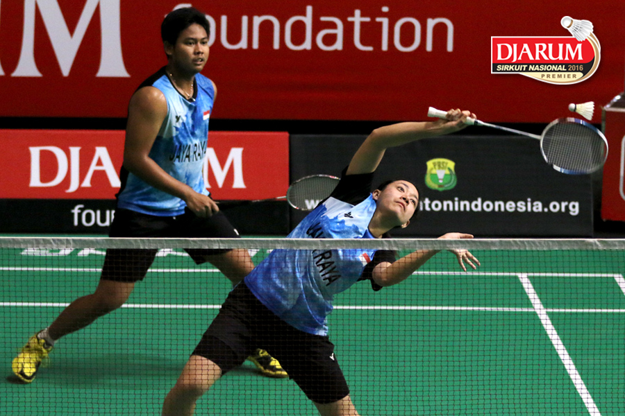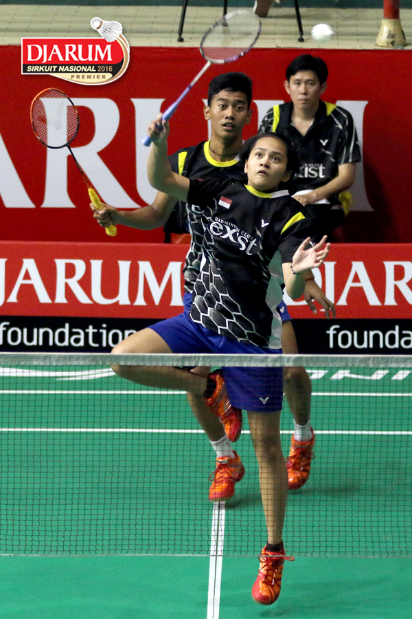 Irfan Fadhilah/Weni Anggraeni (Jaya Raya) Mengembalikan Shuttlecock.