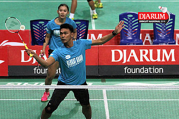 Ardiansyah Putra/Devi Tika (Berkat Abadi) bersiap menyambar pengembalian tanggung