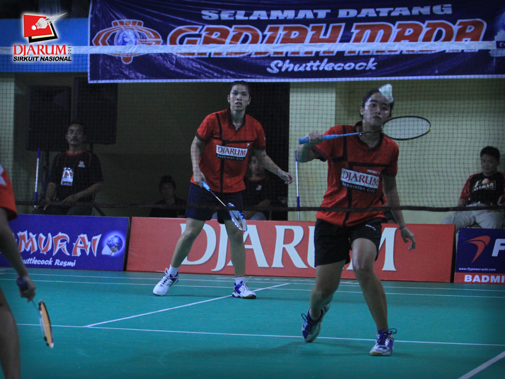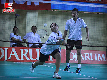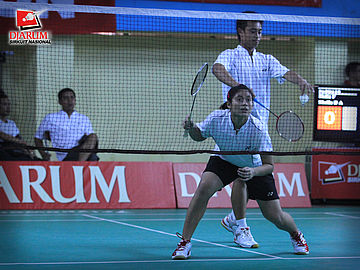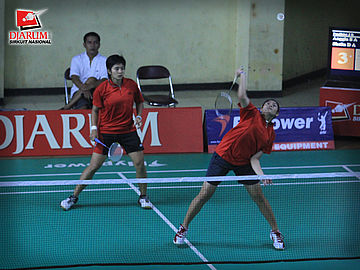 Anggia-Shella (Pusdiklat Jaya Raya) dalam aksi siap smes kok