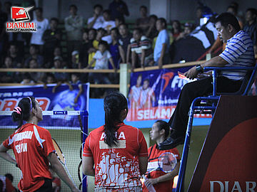 Athiatun/Devi Tika Permatasari (PB Jaya Raya Suryanaga/PB SGS PLN) protes kepada wasit