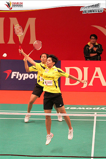 Pasangan Amelia Alicia Anscelly dan Soong Fie Choo (Malaysia Tigers Badminton Club) mengembalikan kok ke arah pasangan Ayaka Takahashi dan Misaki Matsutomo (Unisys Badminton Club Jepang)