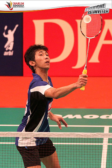 Takuna Ueda (Unisys Badminton Club Jepang) mengembalikan kok ke arah Wisnu Yuli (PB Mutiara)