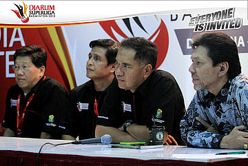 Ketua Umum PB PBSI, Gita Wirjawan (kedua kanan) melakukan konfrensi pers usai menyaksikan Djarum Superliga 2013.
