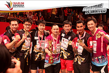 Selebrasi PB Musica Champion setelah berhasil memastikan diri menjadi juara di Djarum SUperliga Badminton 2013