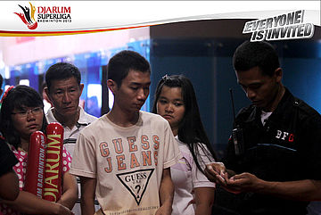 Seorang petugas sedang memeriksa tiket penonton yang akan menyaksikan Final Djarum Superliga Badminton 2013 di DBL Arena Surabaya