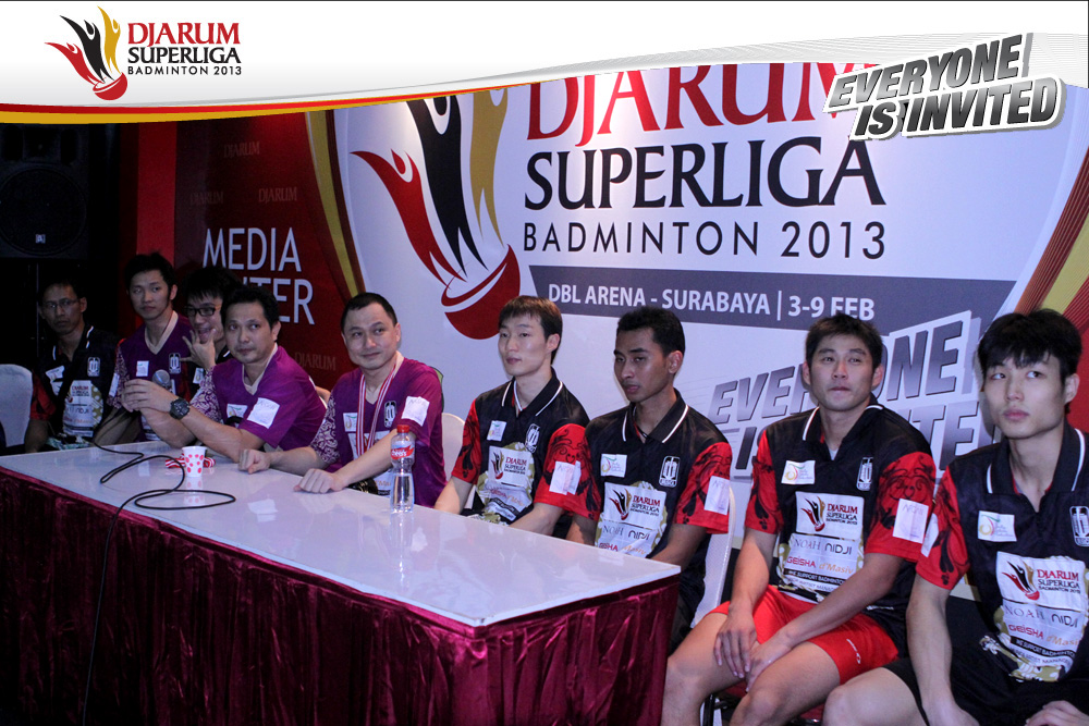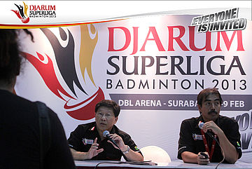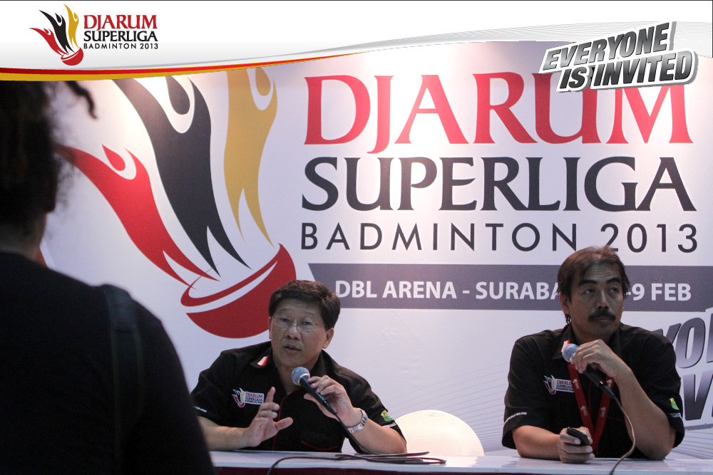 Direktur Djarum Superliga Badminton 2013 Yoppy Rosimin (kiri) didampingi Broto (kanan) saat melakukan press conference
