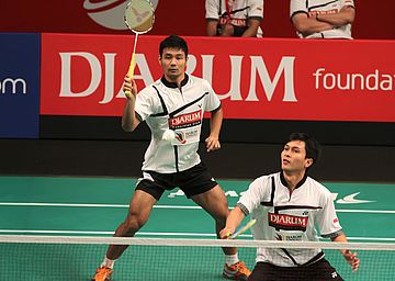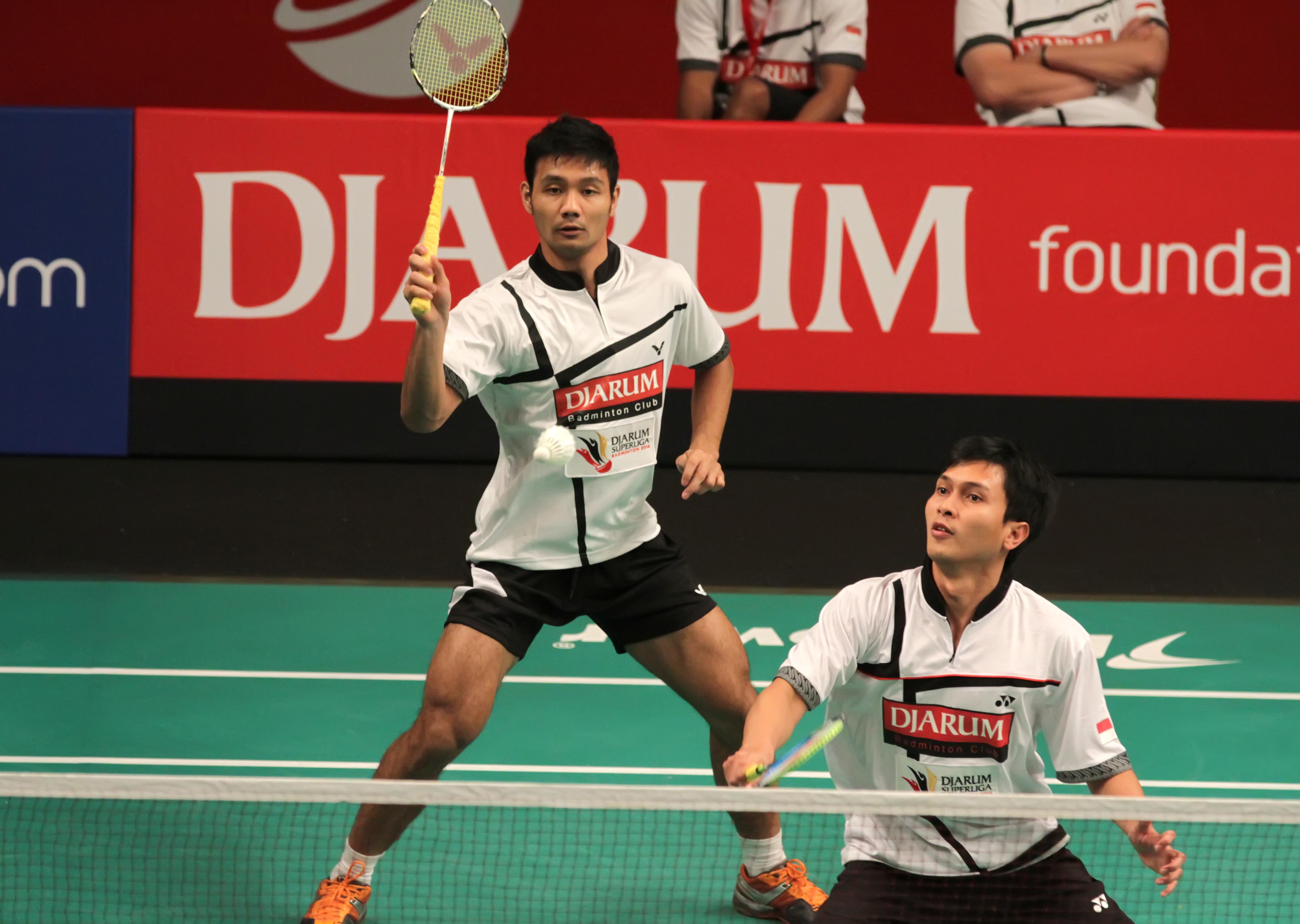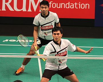 Ahsan dan Berry bersiap menghadang shuttle cock lawan