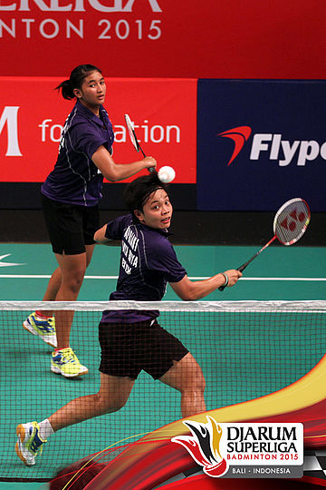 Devi Tika Permatasari/Keshya Nurvita Hanadia (Jaya Raya Suryanaga) bersiap menyambar pengembalian dari Duanganong Aroonkesom/Kunchala Voravichitchaikul (Granular Thailand).