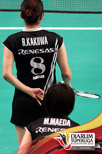 Miyuki Maeda/Reika Kakiiwa (Renesas Jepang) memberikan isyarat saat berhadapan dengan Apriyani Rahayu/Jauza Fadhila (Jaya Raya New Star).