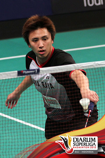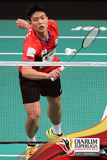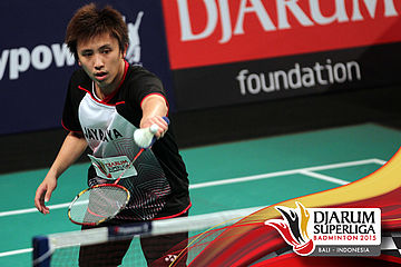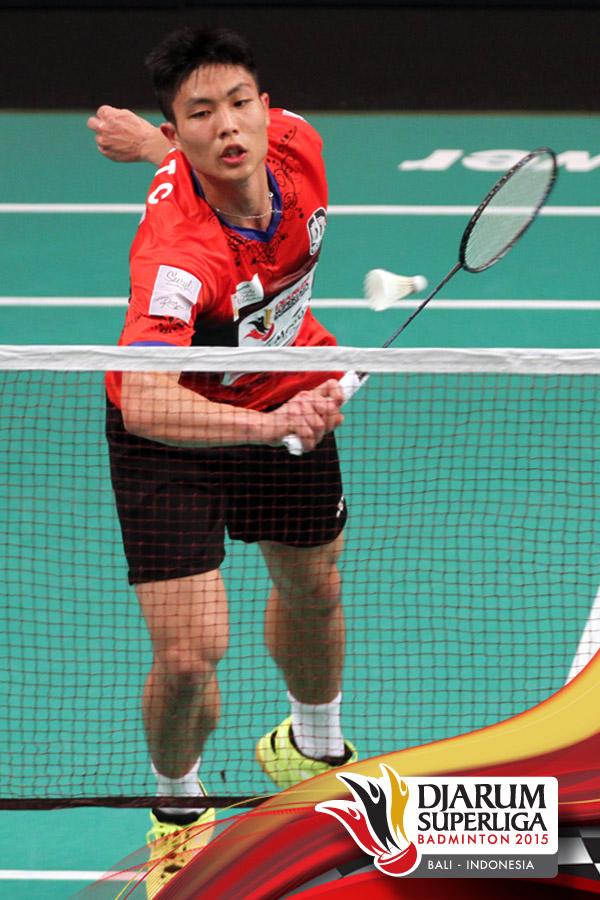 Chou Tien Chen (Musica Champion) menyambar pengembalian tanggung dari Koji Naito (Hitachi Jepang).