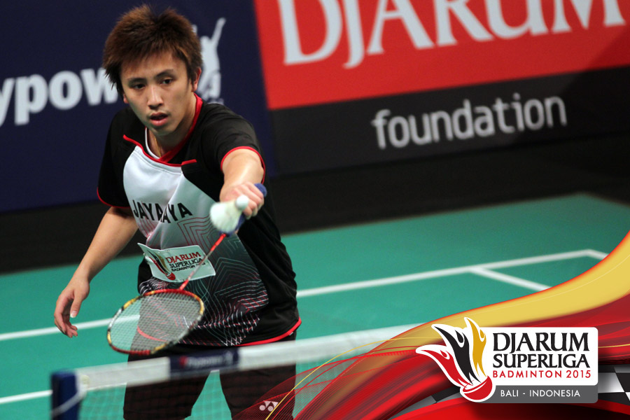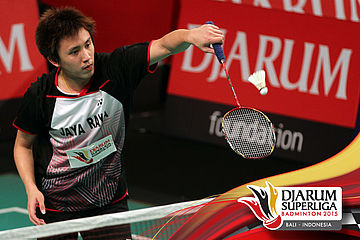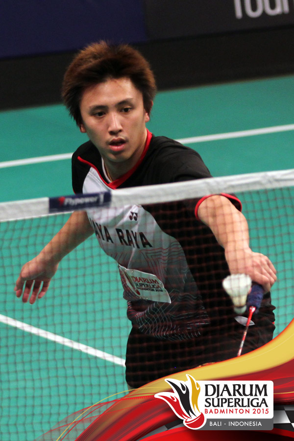 Tanongsak Saensomboonsuk (Jaya Raya) mengembalikan shuttlecock ke arah Rizky Antasari (Hi Qua Wima).