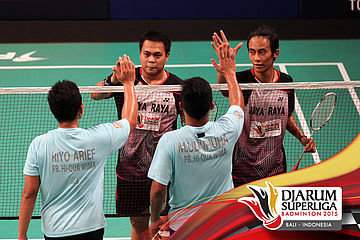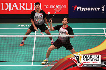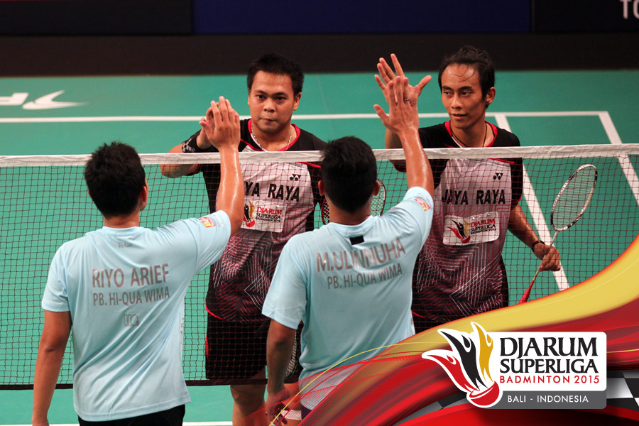 Angga Pratama/Hendra Setiawan (Jaya Raya) bersiap menyambut pengembalian dari Ade Yusuf/Rizky Hidayat (Hi Qua Wima).