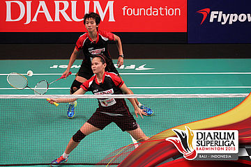 Jenna Gozali/Komala Dewi (Djarum Kudus) menghadang seangan yang dilepaskan Patalmas Muenwong/Chayanit Chaladchalam (Granular Thailand).