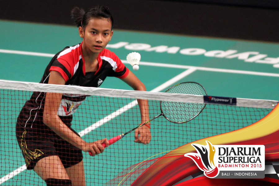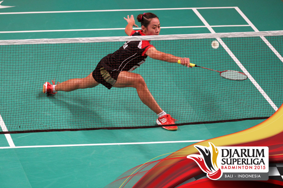 Dinar Dyah Ayustine (Djarum Kudus) menghadang serangan dari Kuljira Khongdee (Granular Thailand).