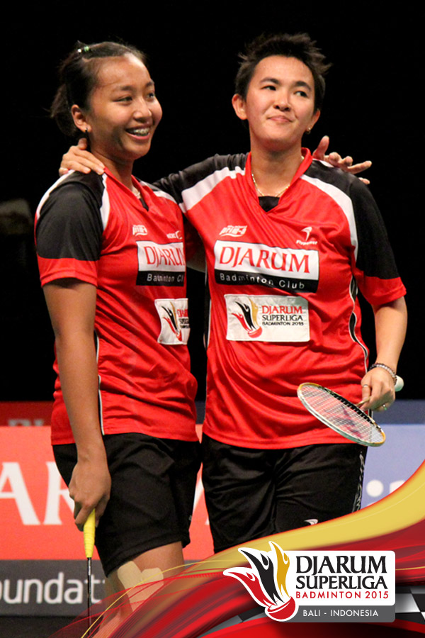 Rosyita Eka/Vita Marissa (Djarum Kudus) saling berpelukan setelah berhasil memenangkan pertandingan melawan Nagahara Wakana/Matsumoto Mayu (Hokuto Bank Jepang).