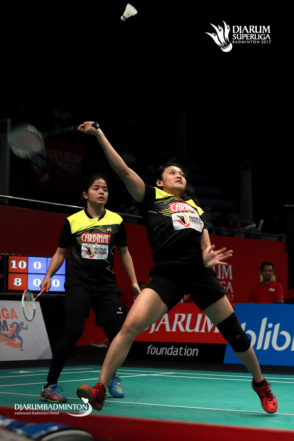 Maretha Dea Giovani/Suci Rizki Andini (PB Mutiara Cardinal) menyambut pengembalian.