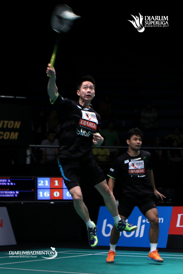 Berry Anggriawan/Kevin Sanjaya (PB Djarum) melepaskan serangan.