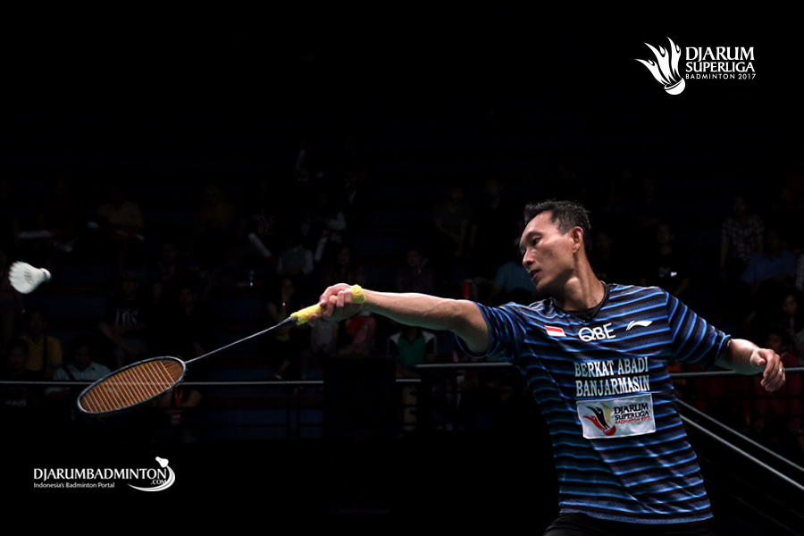 Sony Dwi Kuncoro (PB Berkat Abadi) mengembalikan shuttlecock.