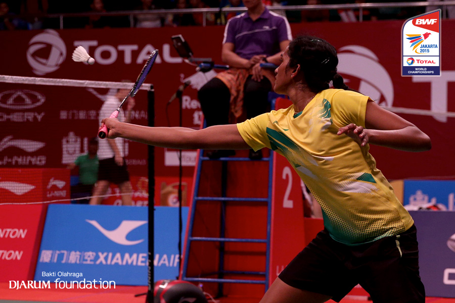 P.V Sindhu (IND) mengembalikan shuttlecock ke arah lawan