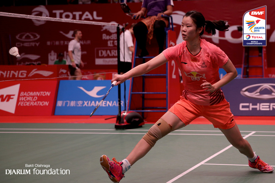 Li Xuerui (CHN) mengembalikan shuttlecock ke arah lawan