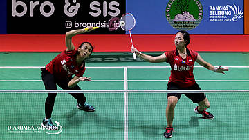 Febriana Dwipuji Kusuma/Ribka Sugiarto (INA) menghadang serangan