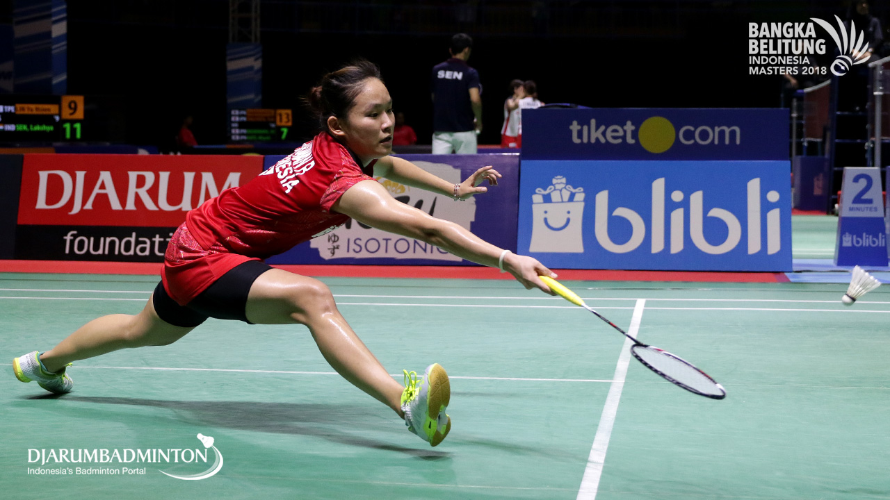 Febriana Dwipuji Kusuma/Ribka Sugiarto (INA) berusaha menggapai pengembalian