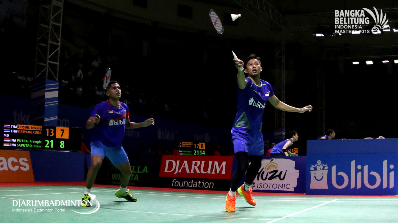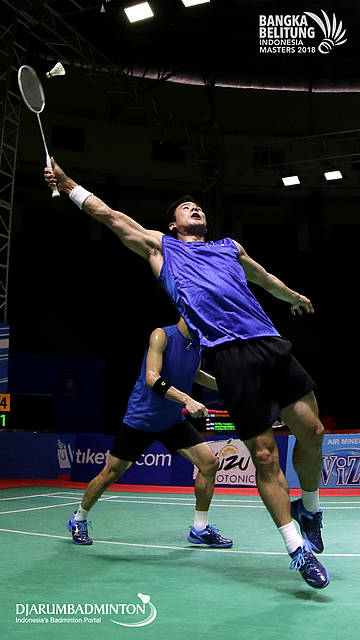 Frengky Wijaya/Rian Agung Saputro (INA) mengembalikan shuttlecock