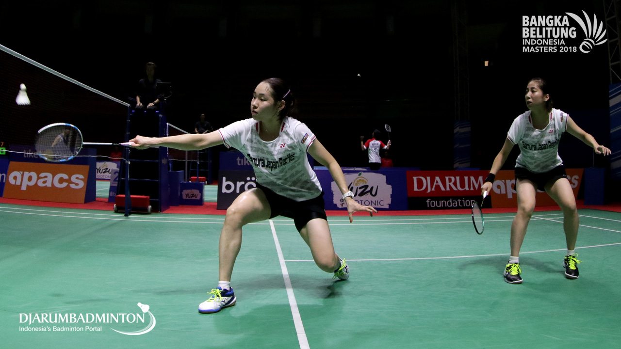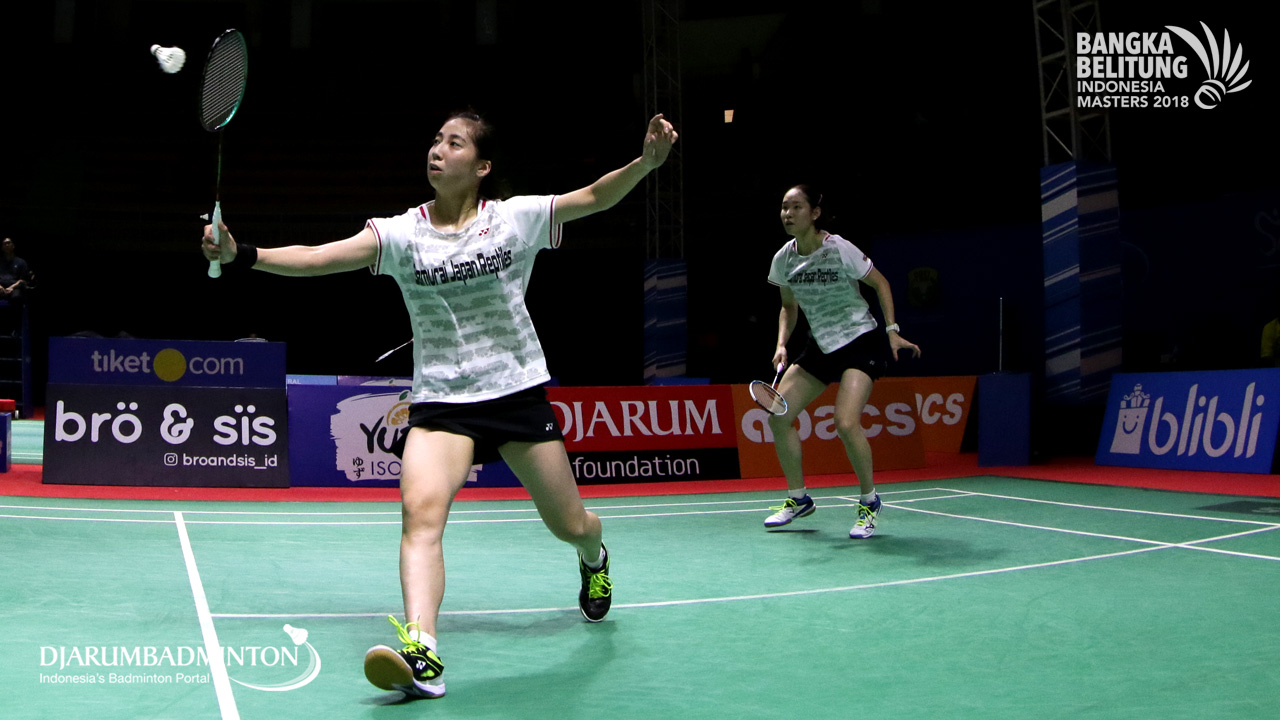 Akane Araki/Riko Imai (JPN) mengembalikan shuttlecock