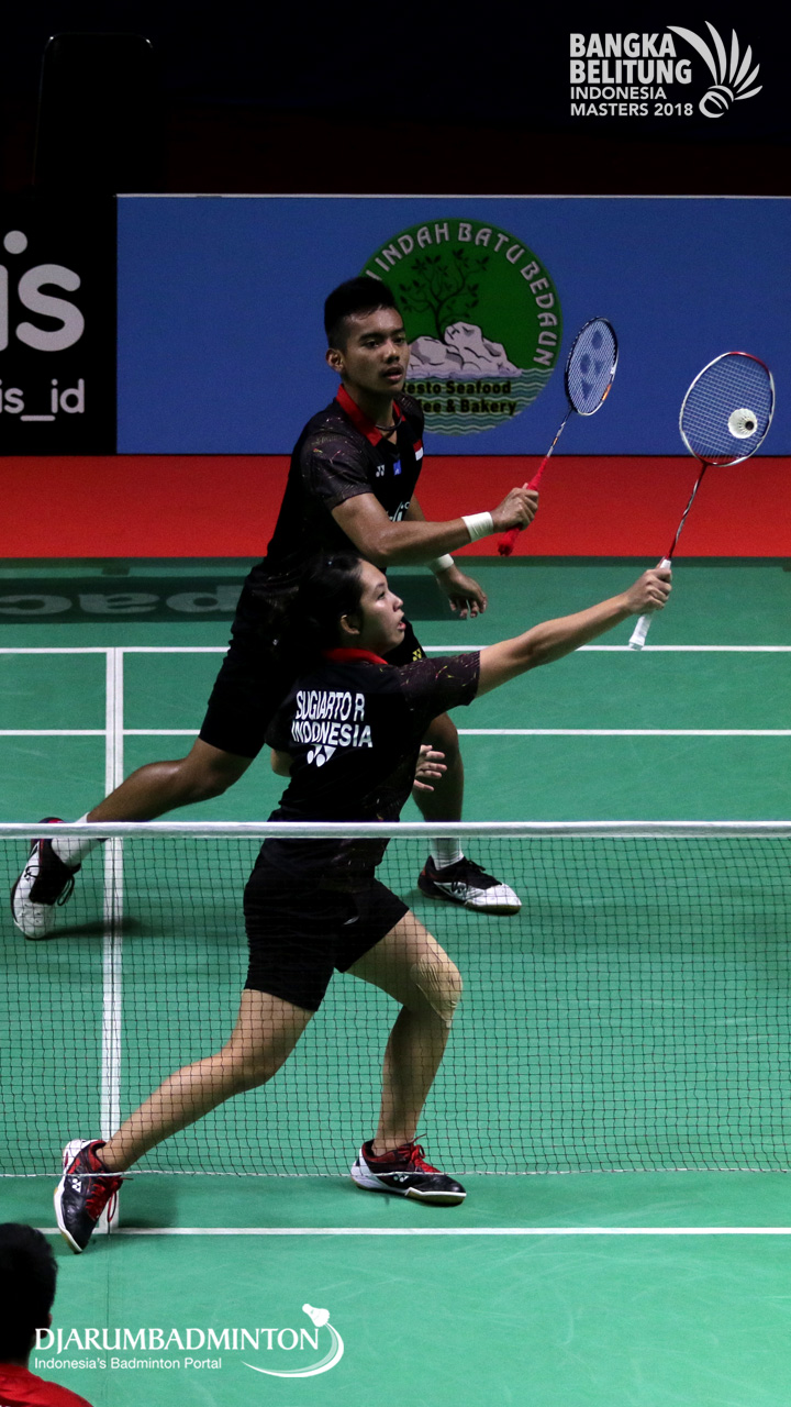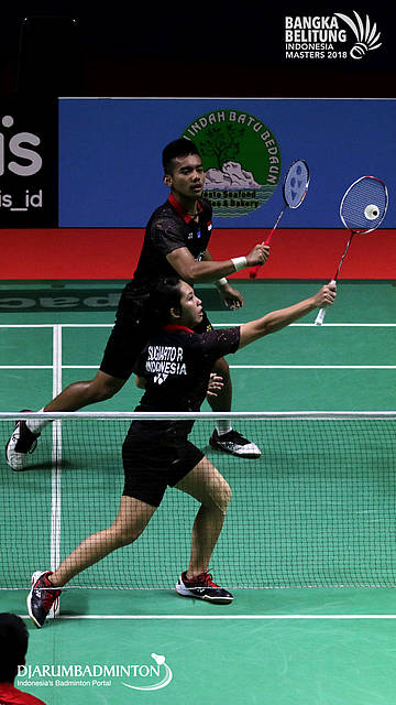 Pramudya Kusumawardana Riyanto/Ribka Sugiarto (INA) menghadang pengembalian
