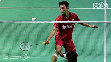 Ihsan Maulana Mustofa (INA) mengembalikan shuttlecock