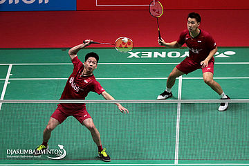 Kevin Sanjaya Sukamuljo/Marcus Fernaldi Gideon (Indonesia) Mengembalikan Shuttlecock