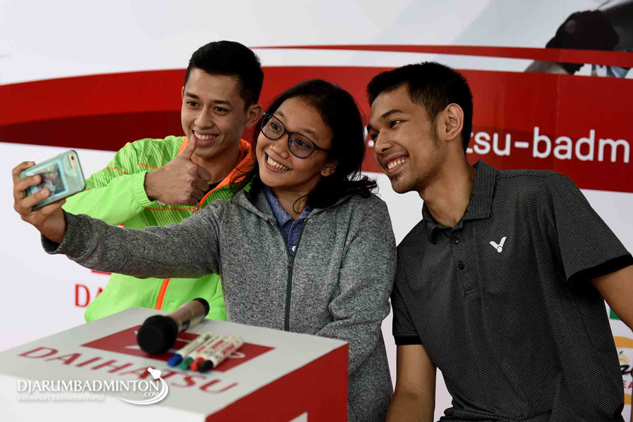 Salah Satu Fans Berfoto Bersama Fajar Alfian Dan Muhammad Rian Ardianto Saat Meet And Greet Daihatsu Indonesia Masters 2018