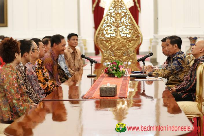 JAKARTA - Tim Piala Thomas dan Uber 2016 diterima oleh Presiden Republik Indonesia, Joko Widodo di Istana Negara, Jalan Medan Merdeka Utara, Selasa (10/5). Pertemuan kali ini diadakan untuk melepas punggawa-punggawa Indonesia yang akan bertanding di Kunshan, Tiongkok. Pada pertemuan tersebut, Jokowi menyatakan dukungan sekaligus optimismenya kepada tim Indonesia.