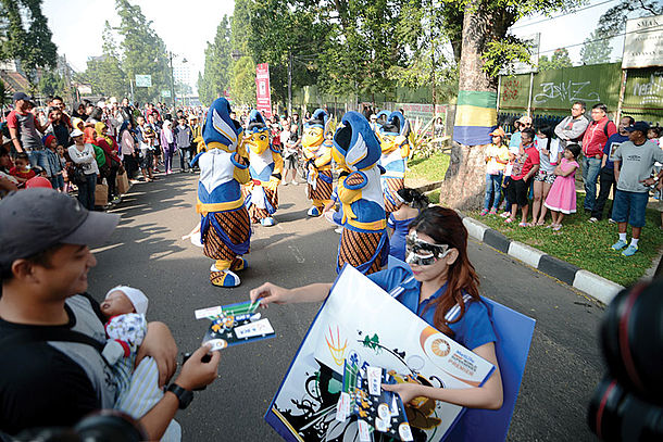 Setelah itu, mereka langsung menaiki Bandros (Bandung Tour of The Bus) yang didatangkan langsung dari Bandung pada, Minggu (21/8) malam. Kemudian mereka langsung diarak menuju jalanan padat Kota Jakarta mulai dari keluar tol bandara, Slipi, memasuki kawasan Senayan, lalu diputar lagi menuju Jl. Jendral Sudirman, naik ke Jembatan Semanggi, melipir ke Jl. Gatot Subroto dan selesai di depan Kantor Kemenpora.