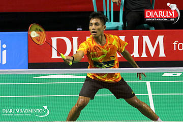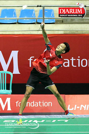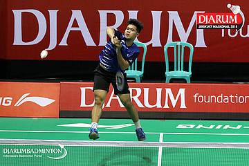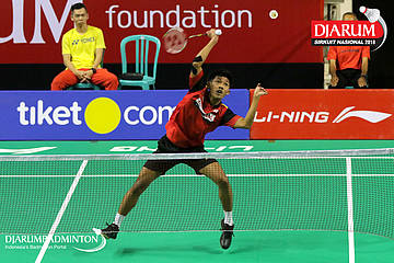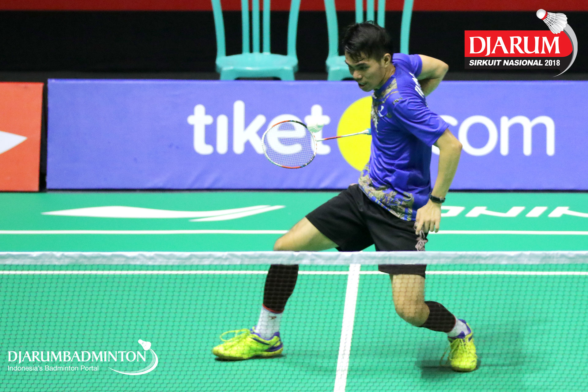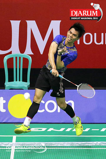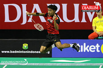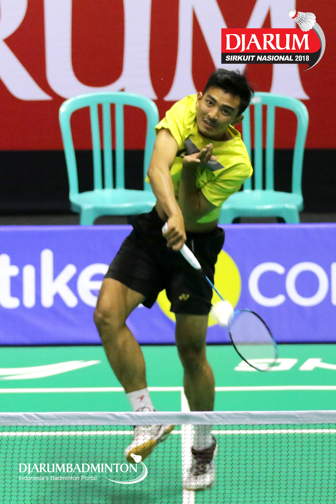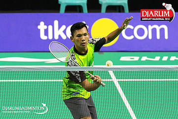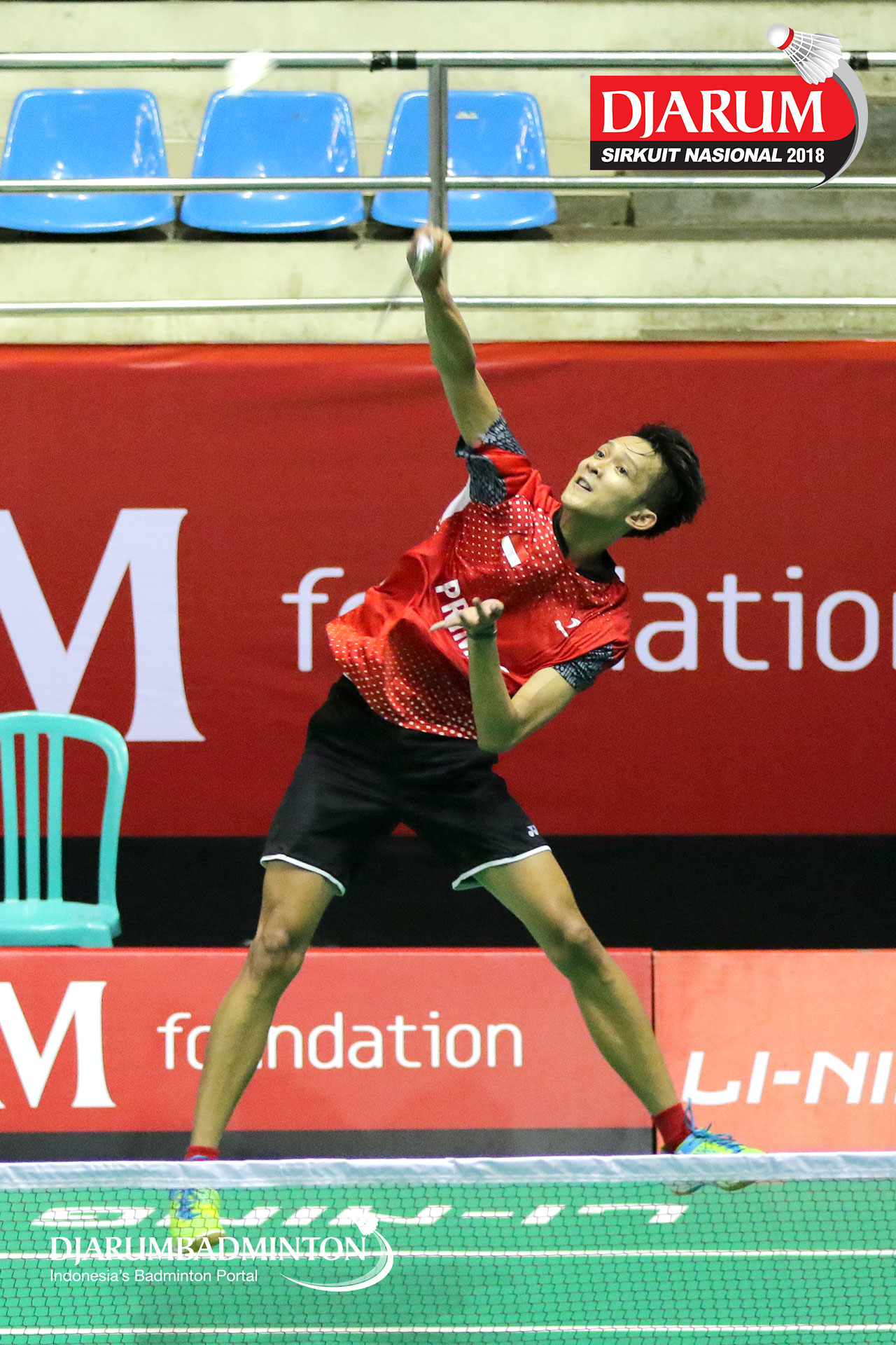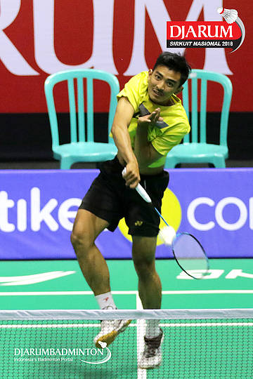 Bagas Kristianto Nugroho (PB Djarum, Kudus) melepakan serangan
