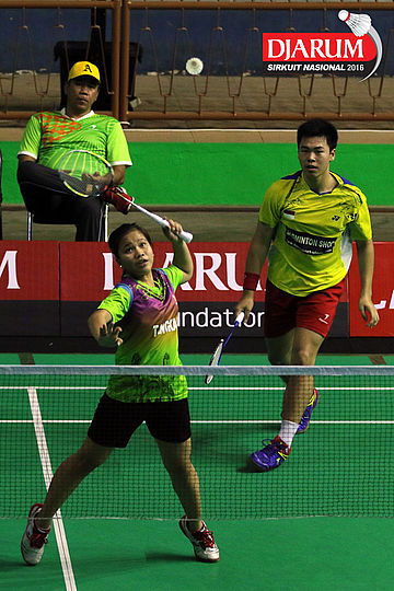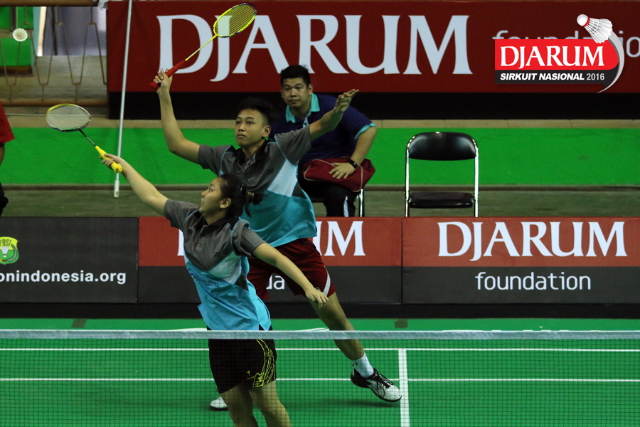 Bryan Sydney/Dea Putri (Tangkas) bersiap menyambar pengembalian tanggung