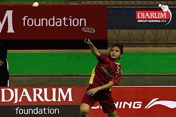 Forverio Rivaldo/Agatha Imanuela (Djarum Kudus) bersiap menyambar pengembalian tanggung