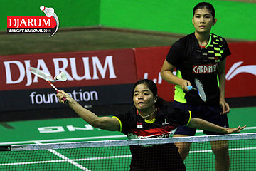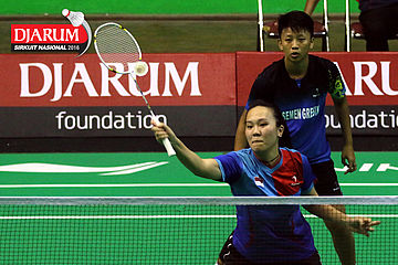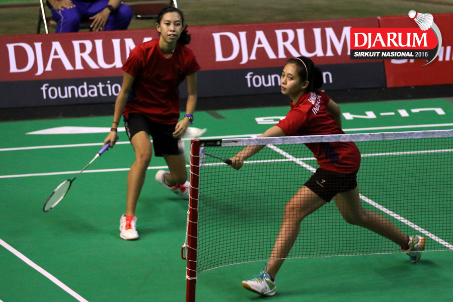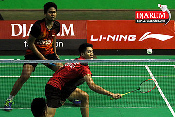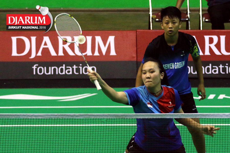 Aghisna Fatkhul/Vehrenica Debora (Semen Gresik/Tangkas) bersiap menyambar pengembalian tanggung