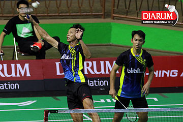 Fran Kurniawan/Fernando Kurniawan (Djarum Kudus) menyambar pengembalian